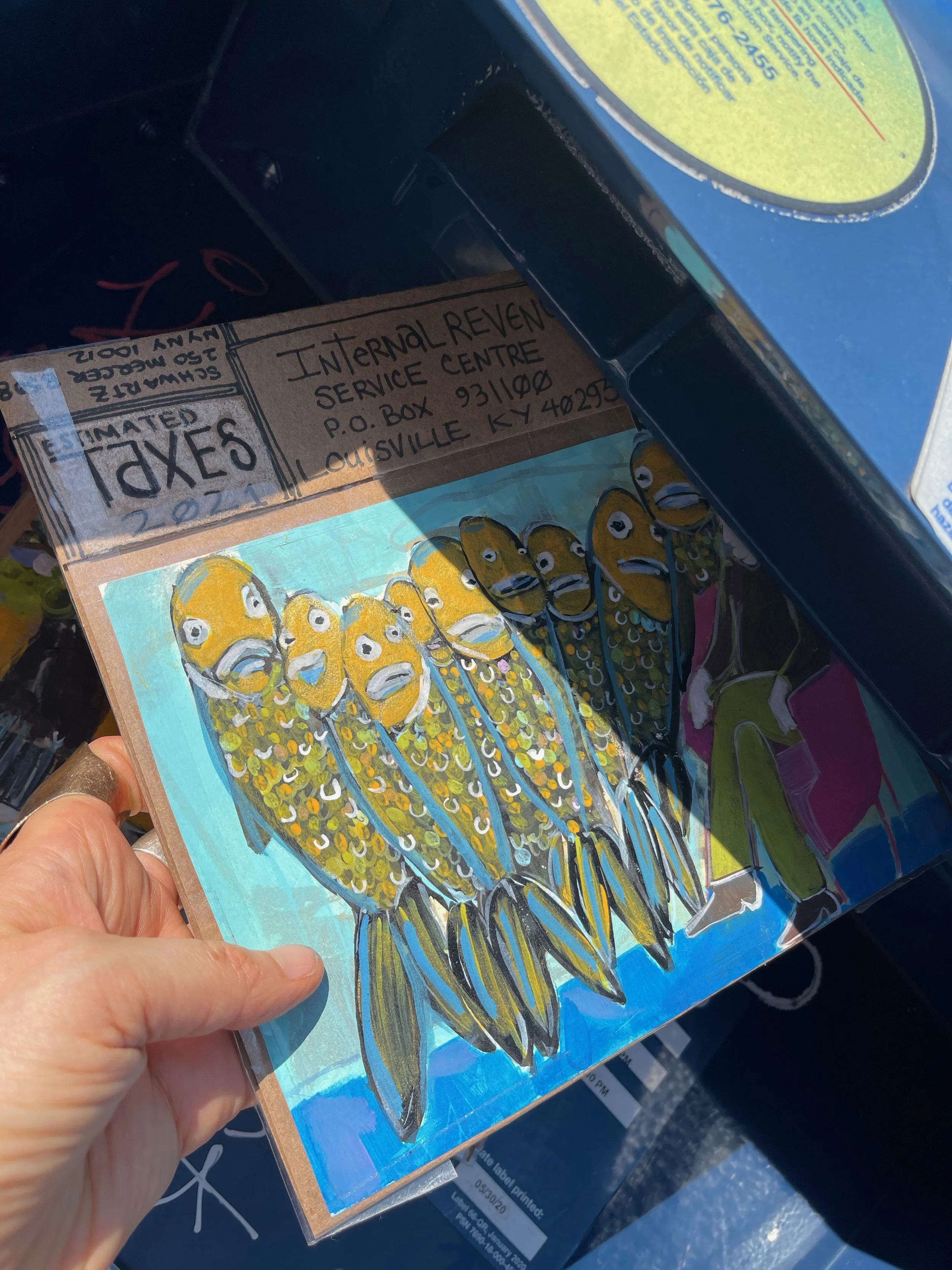 I paint the envelopes I mail my tax payments in and include a hand written letter to the people on the other end. Sometimes they write back. I also paint my art studio rent envelopes and my home envelopes.