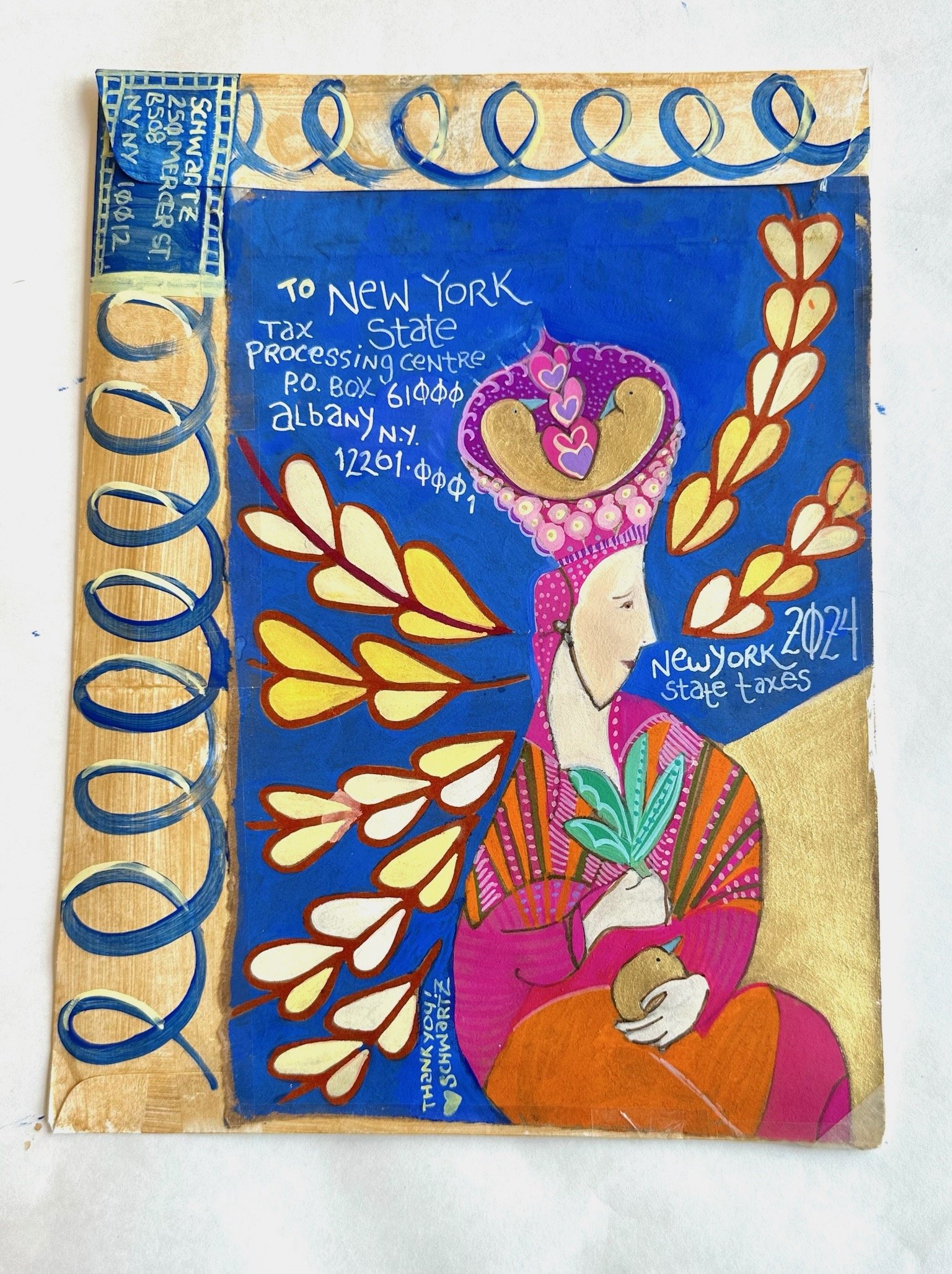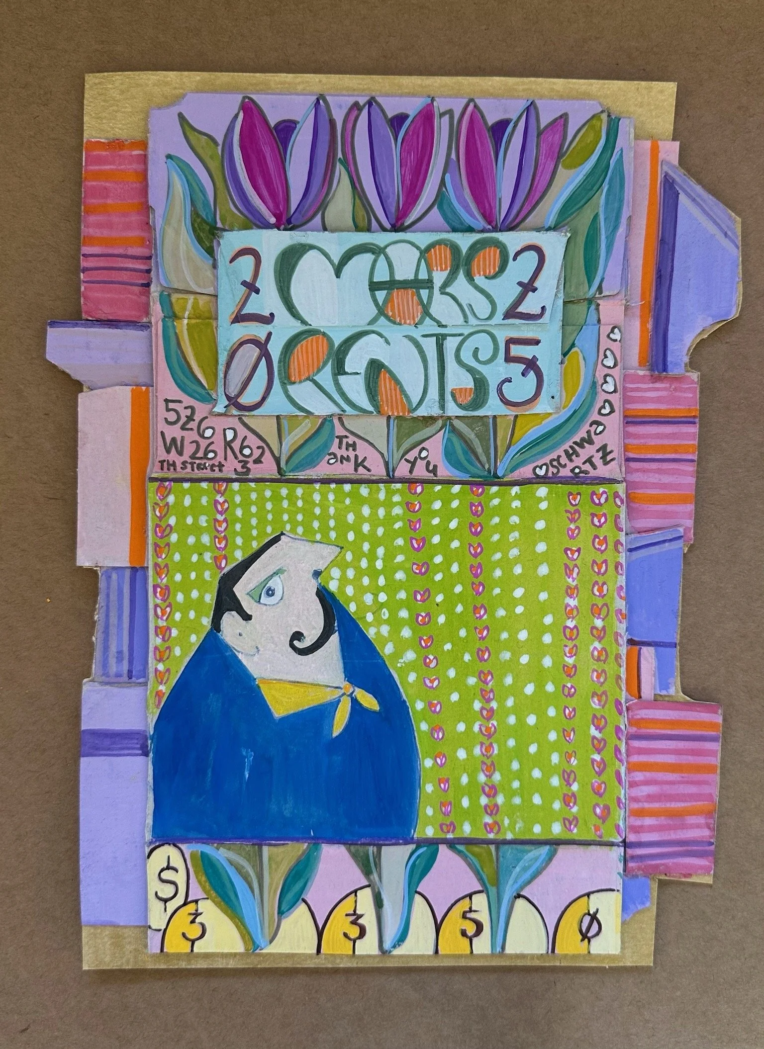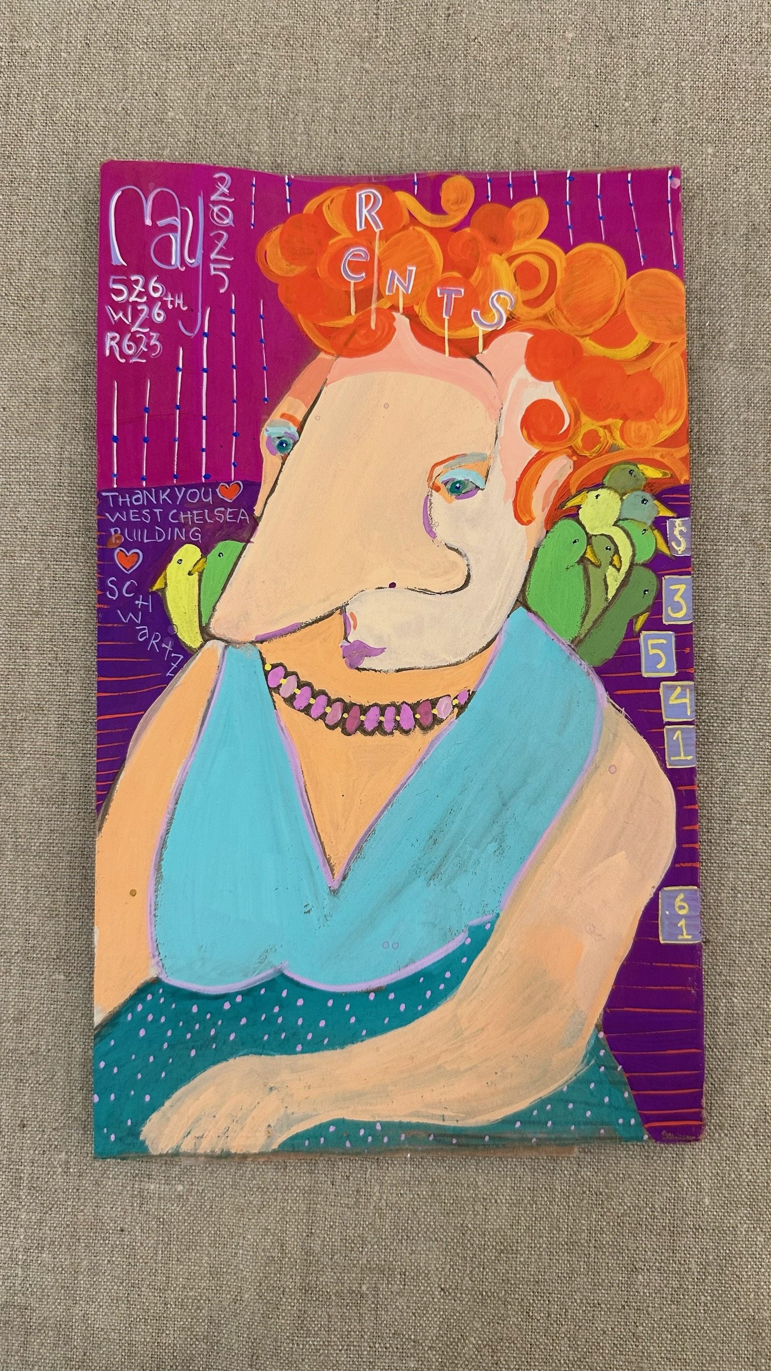 In Envelopes, Jessica Anne Schwartz reimagines the utilitarian function of everyday correspondence, transforming the simple act of paying rent and taxes into a ritual of gratitude, artistic expression and human connection. Each envelope, meticulously hand-painted with narrative and whimsical imagery, serves as both a personal offering and a public acknowledgment of the often-invisible networks that sustain her life and work.