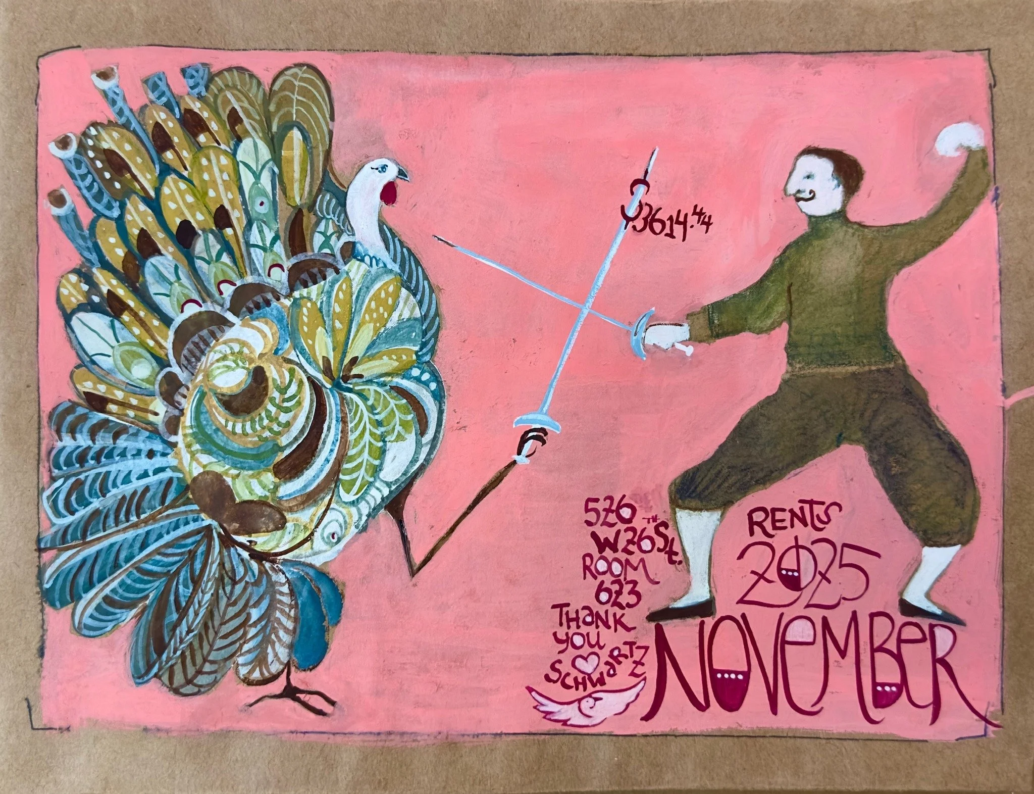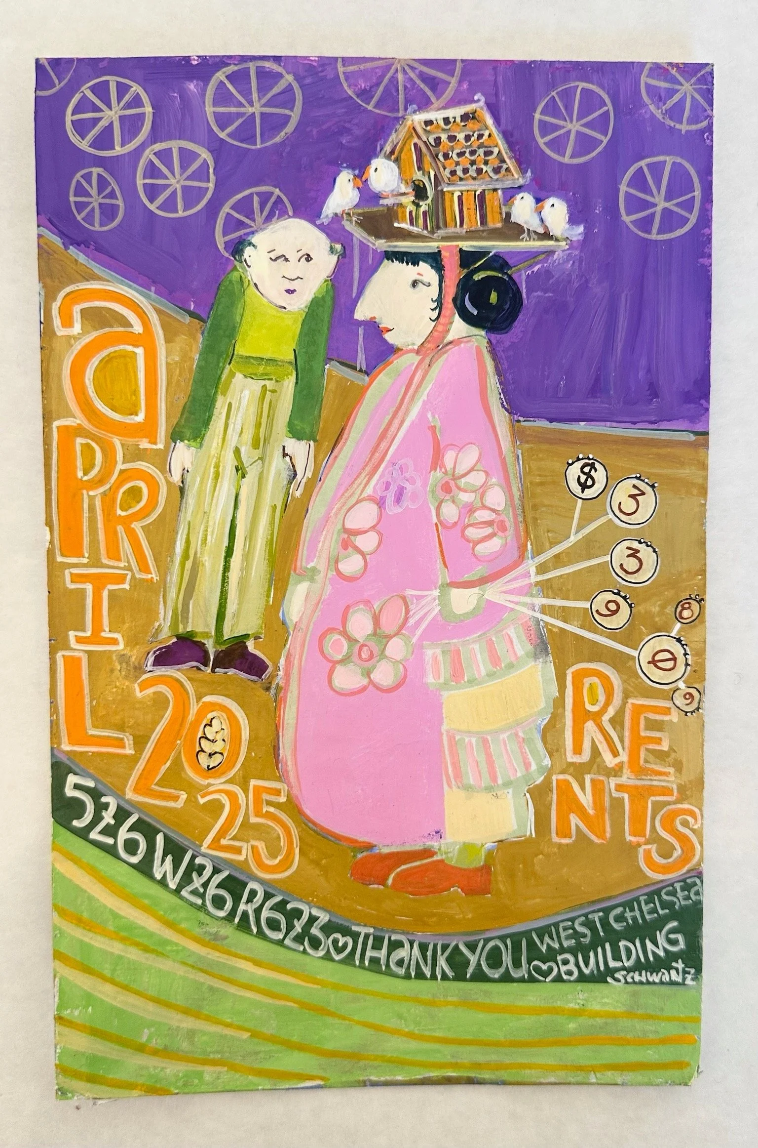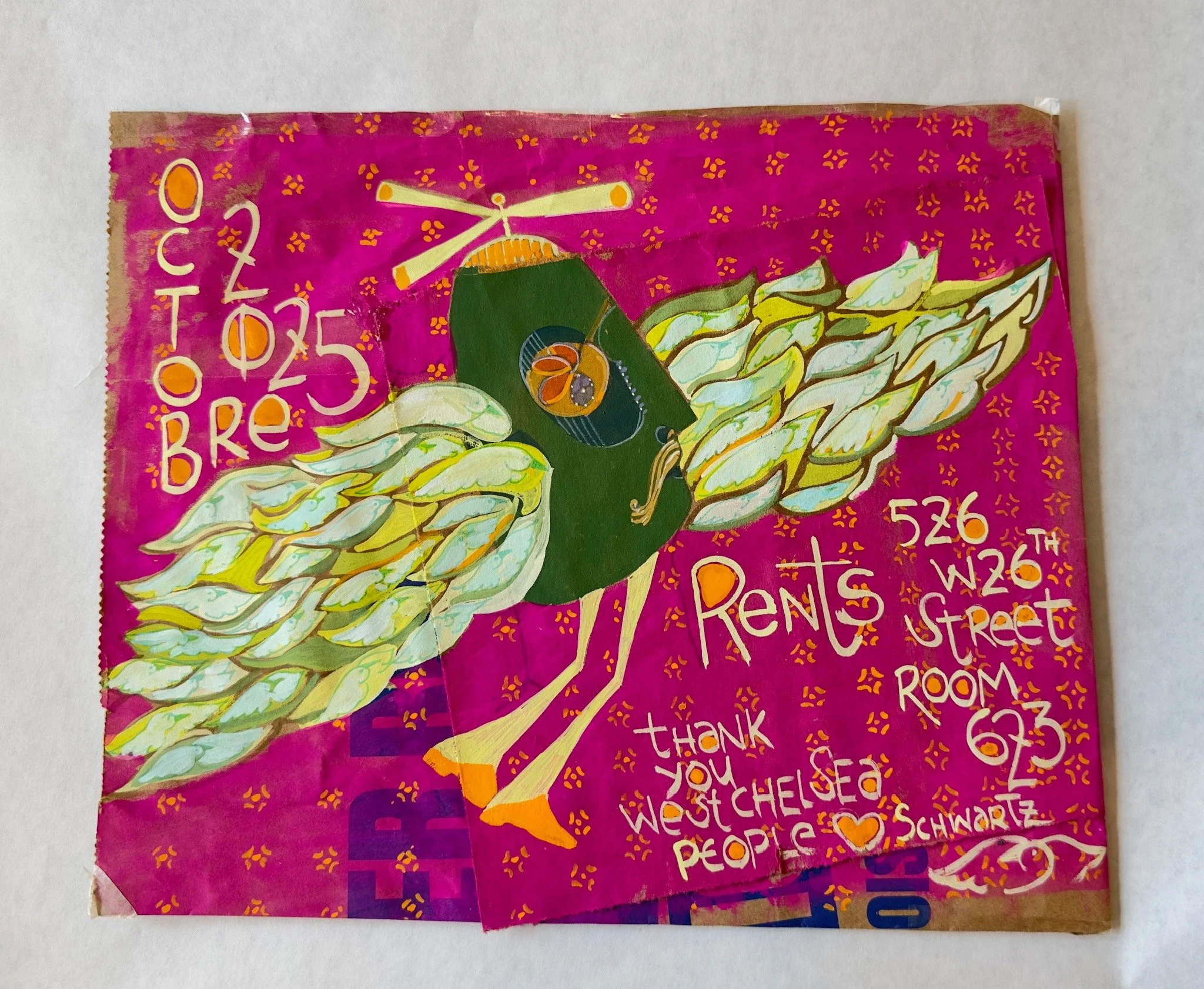 In Envelopes, Jessica Anne Schwartz reimagines the utilitarian function of everyday correspondence, transforming the simple act of paying rent and taxes into a ritual of gratitude, artistic expression and human connection. Each envelope, meticulously hand-painted with narrative and whimsical imagery, serves as both a personal offering and a public acknowledgment of the often-invisible networks that sustain her life and work.