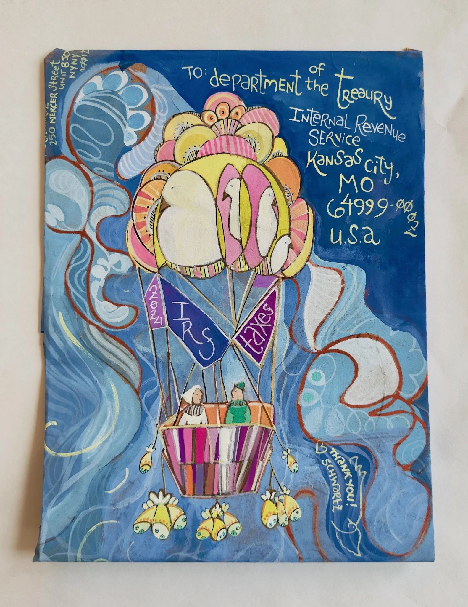 For the envelopes used to pay her taxes, Schwartz includes handwritten letters of thanks, expressing appreciation to the individuals who process her filings. On occasion, they respond with notes of gratitude in return, creating an unexpected and tender dialogue within an otherwise impersonal system. These exchanges underscore the series' central ethos: that even the most routine transactions can become meaningful acts of connection.