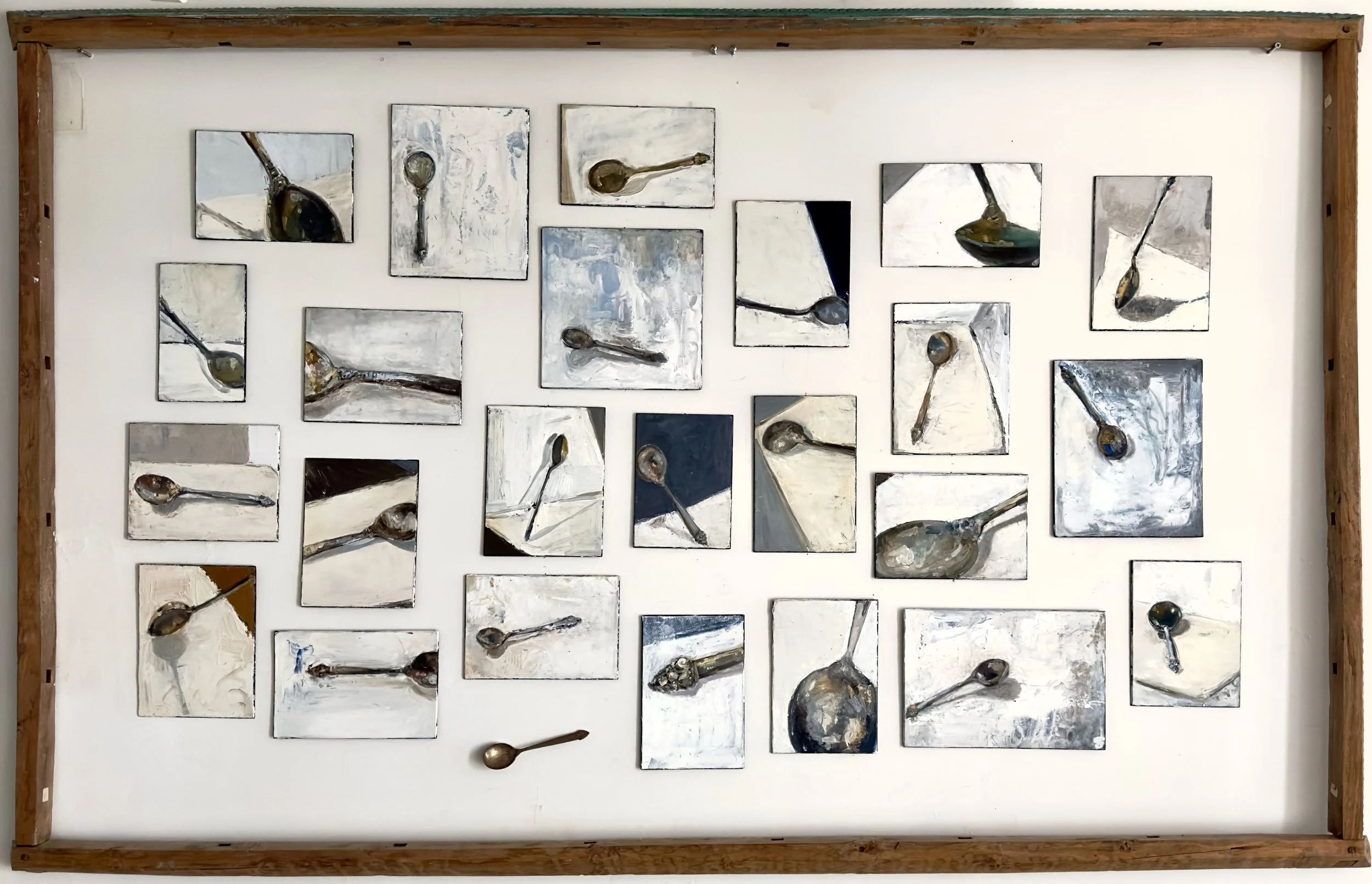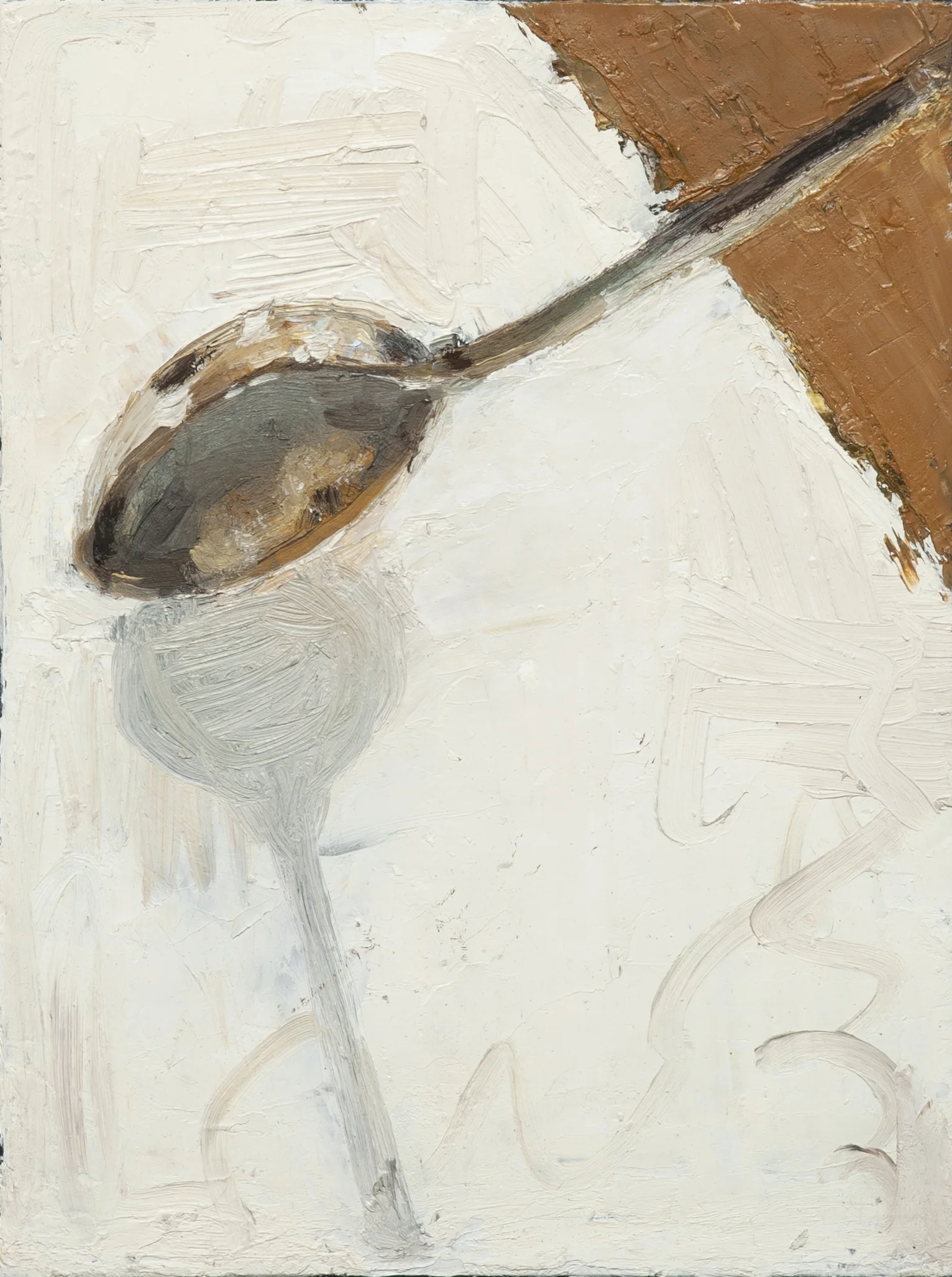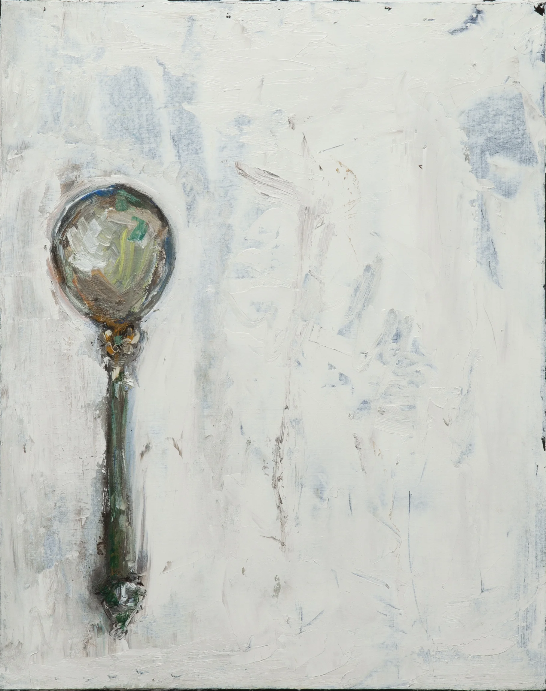 “Single Serving” is a series of twenty-four intimate, small-scale paintings on board, each portraying the same solitary spoon. What began as a chance encounter—finding a discarded spoon buried beneath pile of trash on her way to the studio one morning—evolved into a deeply personal artistic exploration. As Schwartz often experiences synesthesia, the spoon’s form sparked more than a visual response; she heard its story, a melody that wove through her senses and spoke to her own experience of singlehood. Through each brushstroke, she painted what she heard, the spoon becoming a vessel not just for her thoughts, but for her emotions, memories, and the resonance of solitude.
