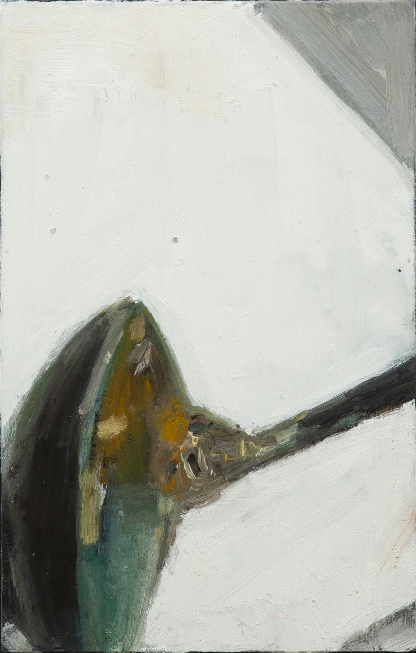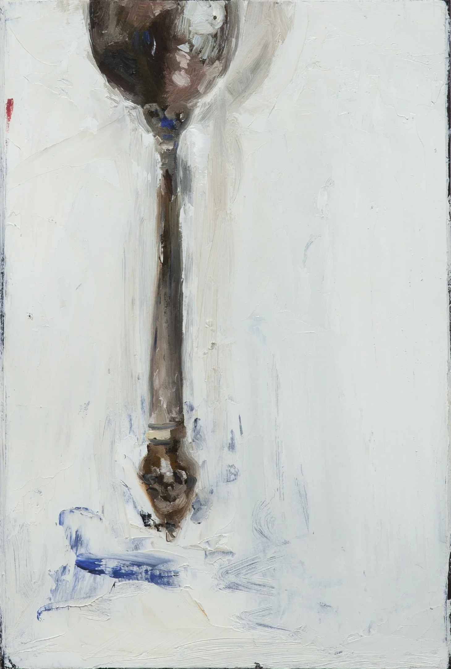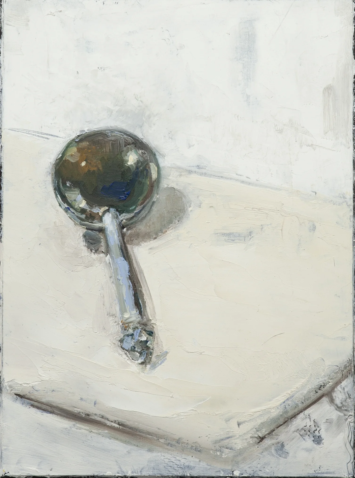 “Single Serving” is a series of twenty-four intimate, small-scale paintings on board, each portraying the same solitary spoon. What began as a chance encounter—finding a discarded spoon buried beneath pile of trash on her way to the studio one morning—evolved into a deeply personal artistic exploration. As Schwartz often experiences synesthesia, the spoon’s form sparked more than a visual response; she heard its story, a melody that wove through her senses and spoke to her own experience of singlehood. Through each brushstroke, she painted what she heard, the spoon becoming a vessel not just for her thoughts, but for her emotions, memories, and the resonance of solitude.